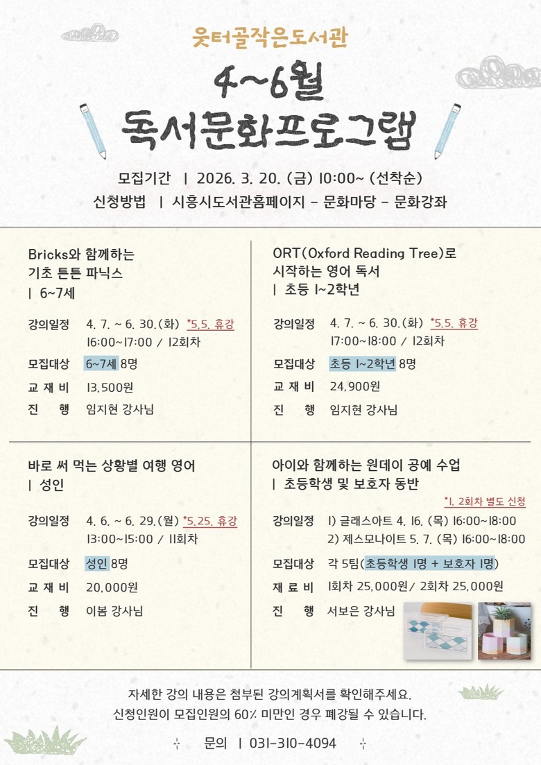 프로그램 신청은 3월 20일 오전 10시부터 도서관 공식 누리집 또는 앱(App)을 통해 선착순으로 할 수 있다. 자세한 사항은 시흥시 도서관 누리집을 참고하거나 소래빛도서관 작은도서관팀(031-310-4094)으로 문의하면 안내받을 수 있다.