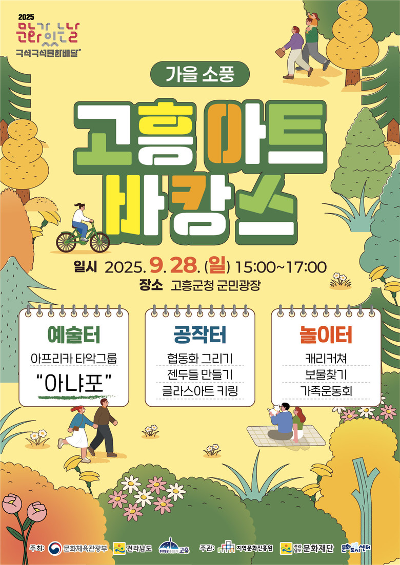 이번 ‘고흥아트바캉스’는 ‘가을 소풍’을 주제로, 군민 누구나 즐길 수 있는 다양한 공연과 체험 프로그램으로 마련된다.
