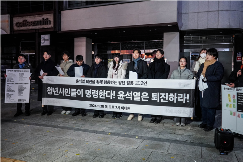 윤석열 퇴진을 위해 행동하는 청년 일동(이하 ‘윤퇴청’)은 28일 저녁 이태원역 1번 출구 인근에서 기자회견을 열어 시국선언을 발표했다.