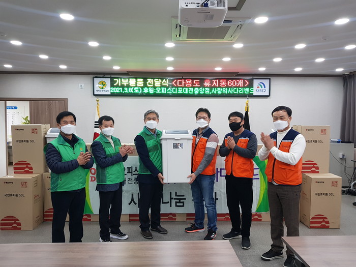 대덕구새마을회 박흥용 회장은 “오늘 오피스디포와 사랑의 사다리 밴드에서 지원해준 국민휴지통은 대덕구 소외계층에게 잘 전달하겠다.”면서 감사함을 전했다.