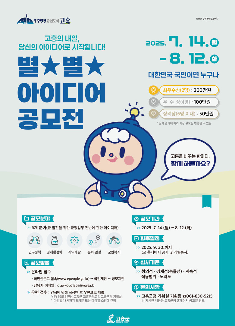 공모 분야는 ▲인구정책 ▲경제 활성화 ▲지역개발 ▲문화·관광 ▲군민복지 등 고흥군의 변화와 발전을 이끌 수 있는 전 분야의 사업 및 정책 아이디어로, 자유롭게 제안할 수 있다.