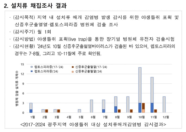 광주보건환경연구원은 지난해 10월 광주지역에서 채집한 야생 설치류에서 신증후군출혈열 바이러스를 확인했으며, 렙토스피라증은 여름철부터 10~11월 사이 주로 검출된다고 설명했다. 특히 최근 호우 복구 및 농작업 과정에서 고인 물과 접촉할 때 감염 위험이 높다고 덧붙였다.