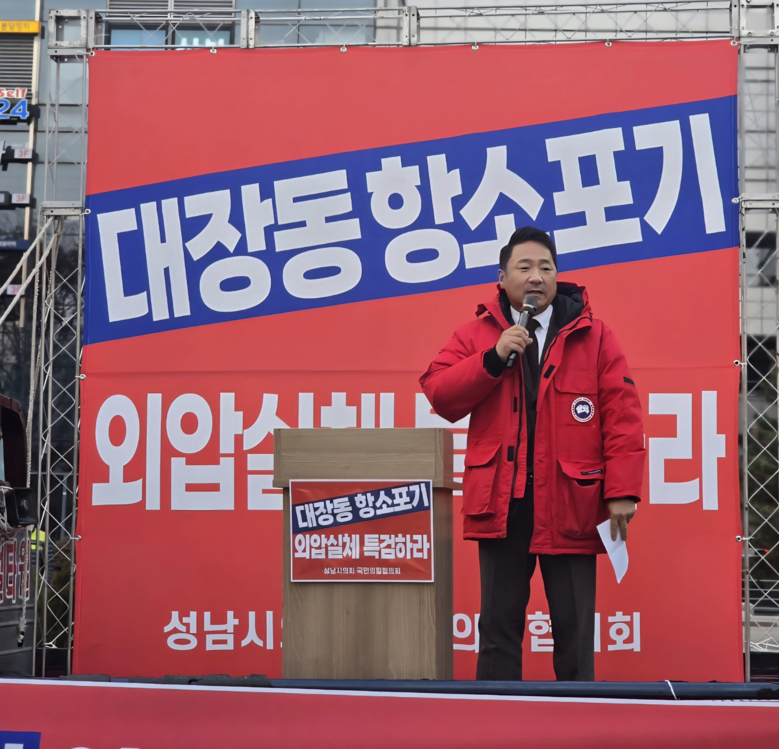 | ▲집회를 주최한 성남시의회 국민의힘협의회 정용한 대표의원.(사진=성남시의회 국힘협의회) |