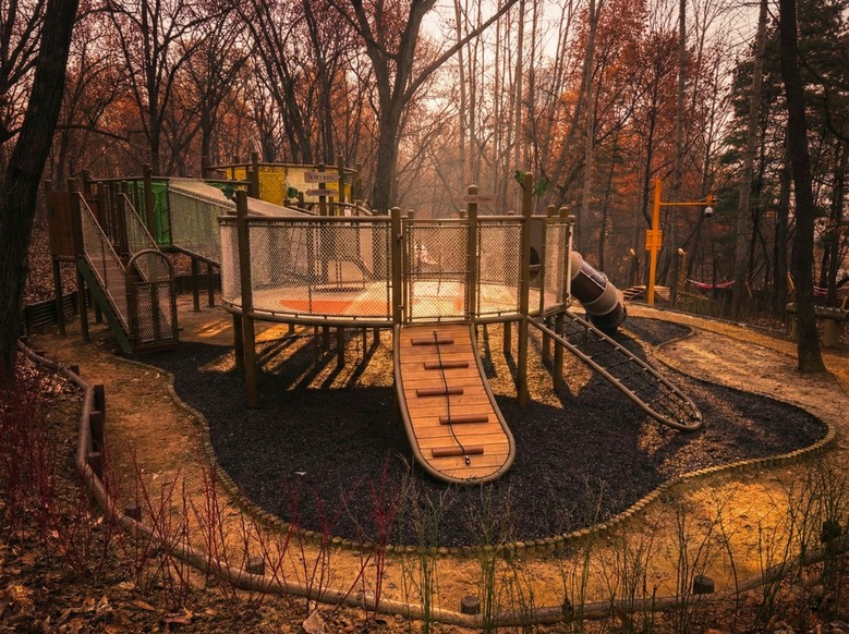 먼저, 명일근린공원 앨리스 유아숲체험원(상일동 산26-1번지 일원)은 서울시 예산 6억원을 투입해 노후된 놀이시설을 철거하고, 아이들의 흥미와 신체 발달을 고려한 체험형 놀이시설 8종을 새롭게 설치하여 일반적인 유아숲체험원과 차별화된 공간으로 조성됐다. ▲대형 그물놀이대 ▲숲속 그네 ▲오두막 미끄럼틀 ▲숲속 모래 놀이터 등 다양한 놀이시설을 갖추어 유아는 물론 만 5세 이상 아이들도 함께 즐길 수 있는 숲속 놀이터로 재탄생했다.