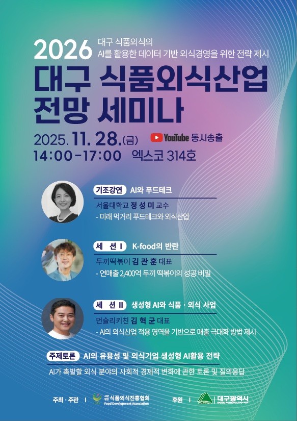 ▸ AI가 촉발할 식품·외식 분야의 변화에 대한 토론의 장 [대구 세계타임즈=한윤석 기자] 대구광역시와 (사)식품외식진흥협회는 11월 28일(금) 오후 2시, 엑스코 서관 314호에서 ‘2025년 제3회 2026 식품·외식산업 전망 세미나’를 개최한다.