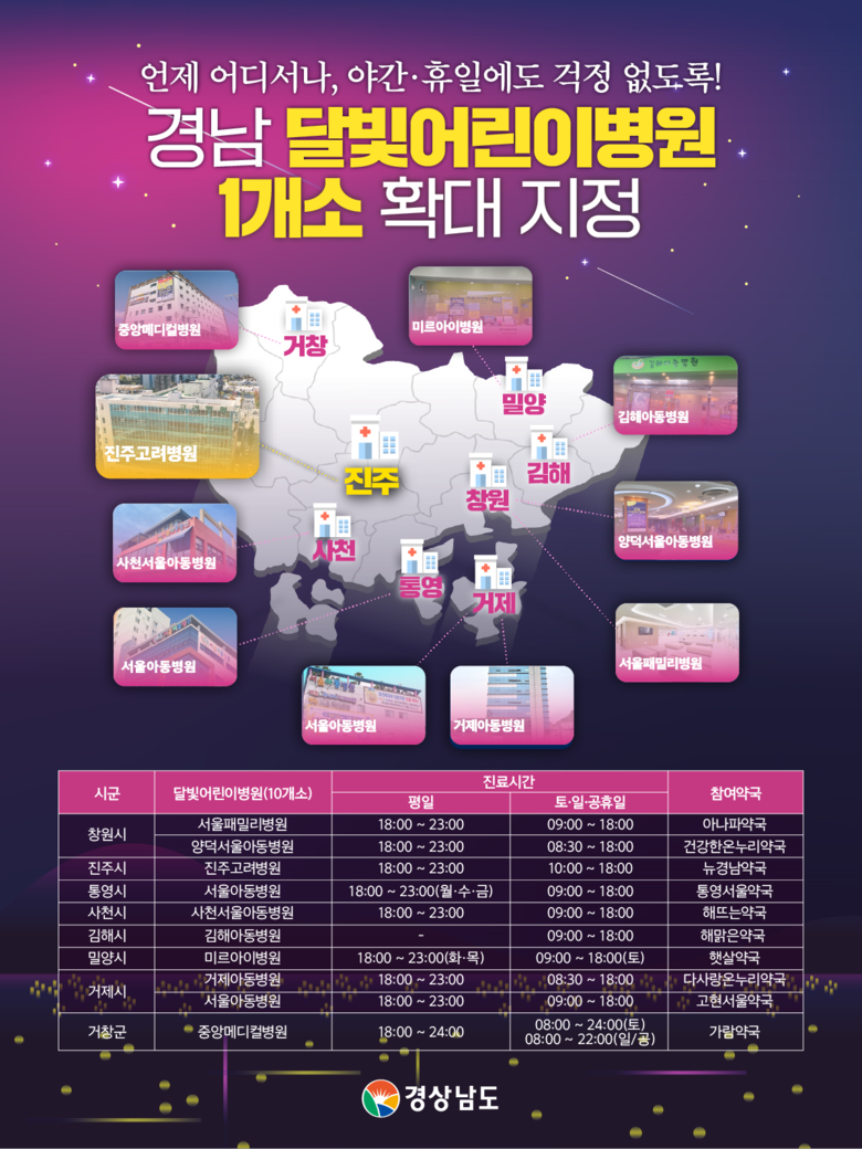이도완 경상남도 보건의료국장은 “달빛어린이병원 신규 지정은 지역 내 소아환자들의 평일 야간·휴일 진료 공백을 줄이고, 신속한 의료서비스를 제공하는 데 도움이 될 것”이라며, “앞으로도 아이와 부모 모두가 안심하고 의료서비스를 이용할 수 있도록 달빛어린이병원 확대 지정에 최선을 다하겠다”고 말했다.