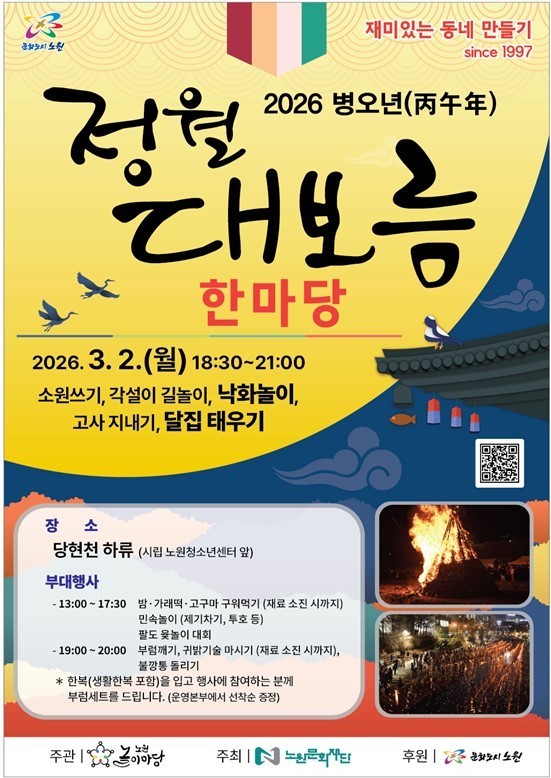 – 볼거리, 먹을거리, 할 거리 풍성… 세시풍속도 남다른 노원구 축제 ‘클래스’ 기대감 [노원구 세계타임즈=이장성 기자] 서울 노원구(구청장 오승록)가 오는 3월 2일 당현천 하류 일대에서 <2026 병오년 정월대보름 한마당> 행사를 개최한다고 밝혔다.