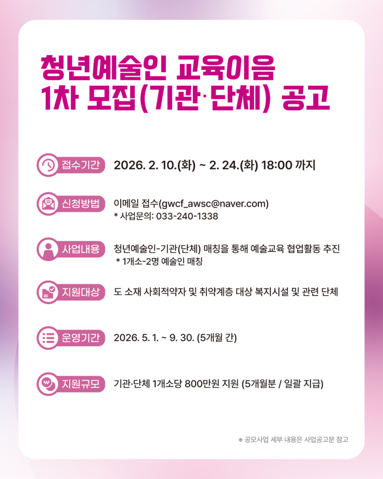 한편, 도내 청년예술인 대상 2차 공모는 오는 3월 중 실시될 예정이다. 자세한 내용은 강원문화재단 홈페이지를 통해 확인할 수 있다.
