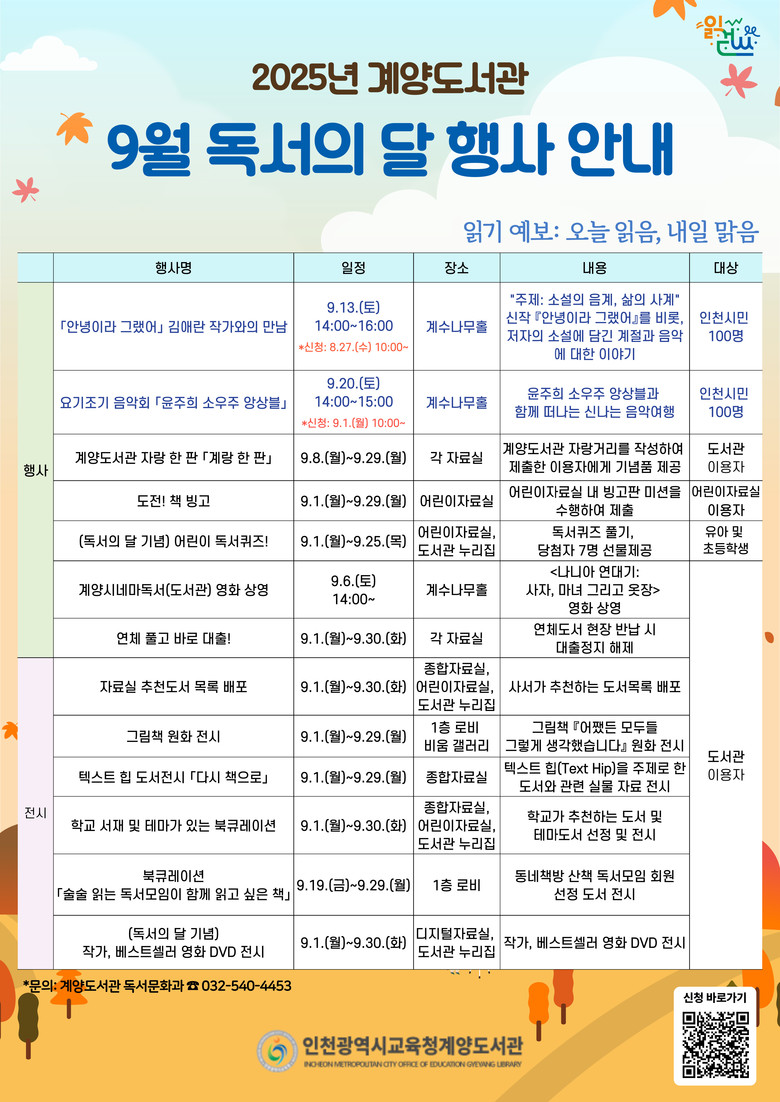 행사 참여는 인천 시민 누구나 가능하며, 자세한 내용은 계양도서관 누리집 공지사항 또는 독서문화과(☎032-540-4453)로 문의하면 된다.