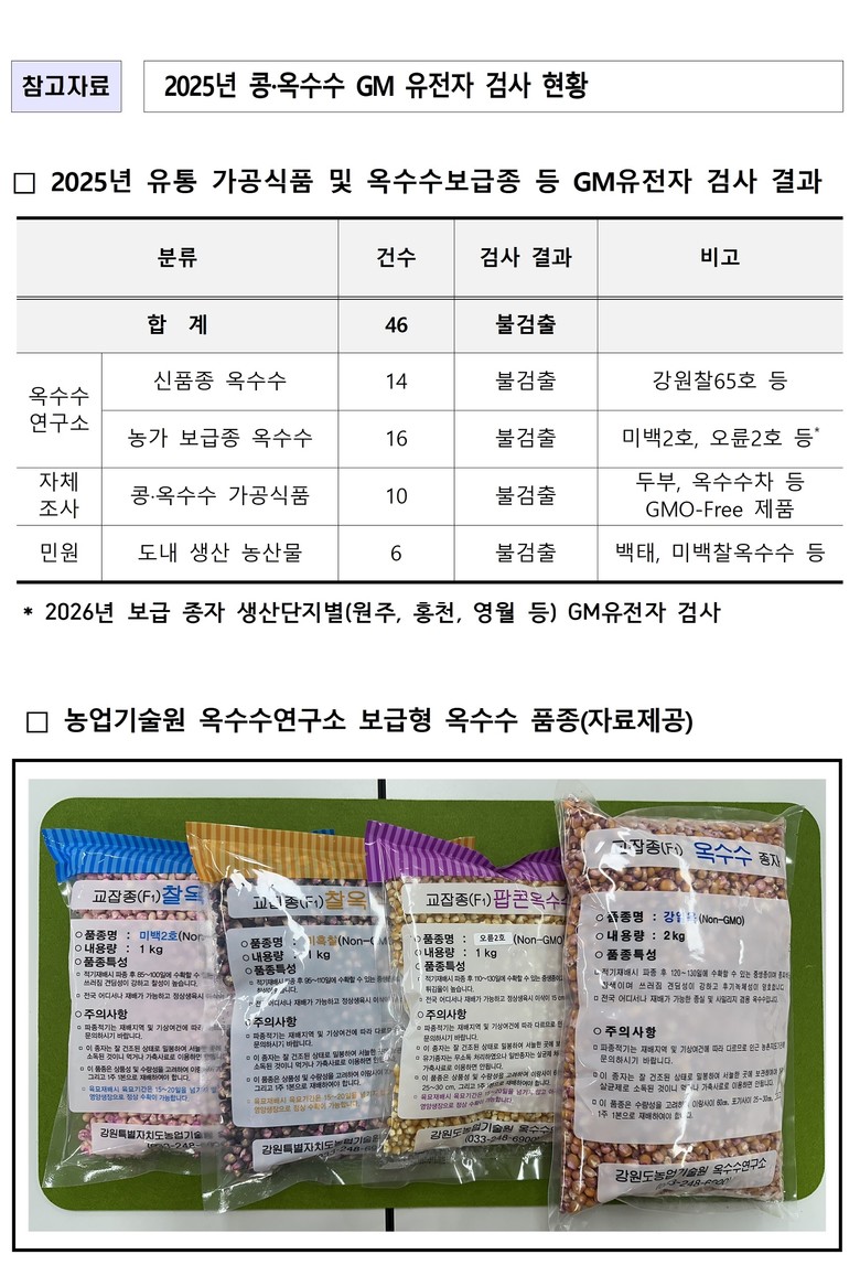 연구원은 2025년 5월부터 12월까지 농업기술원 옥수수연구소(홍천 소재)에서 개발·육성 중인 옥수수 품종 30건과 도내 유통 중인 콩·옥수수 가공식품 16건 등 총 46건을 대상으로 재조합 유전자 혼입 여부를 정밀 검사했다.