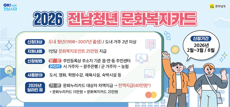 - 취약계층 차감 폐지하고 문화누리카드 이용자도 전액 지원 - [전남 세계타임즈=우덕현 기자] 전라남도가 지역 청년의 문화 향유와 자기계발 기회를 넓히기 위해 19~28세 청년에게 연 25만 원을 지원하는 ‘전남 청년 문화복지카드’ 신청을 3월 말까지 접수한다.