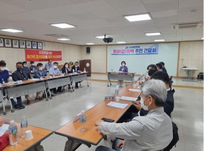 이 자리는 지난 7월 15일 있었던 1차 간담회에 이어 사강시장 침수의 원인을 규명하고 화성시와 한국수자원공사의 대응과 피해 보상 현황을 점검하기 위해 마련되었으며 송산면 이장단을 비롯한 주민대표, 화성시, 한국수자원공사 송산사업단 관계자 등 40여 명이 참석하였다.