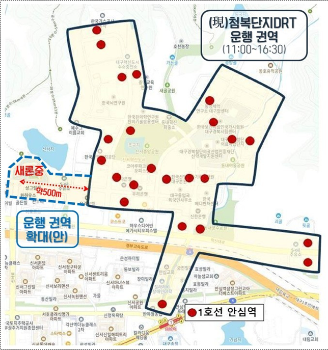 둘째, 수요응답형 교통체계(DRT)의 운행 권역 확대다. 현재 DRT는 첨복단지에서 연호역까지 무려 22km를 운행하면서도, 정작 불과 500m 거리의 새론중학교는 운행 대상에서 제외되어 있다. 이 의원은 “DRT가 비혼잡 시간대에 예약 호출 방식으로 유연하게 운영되는 만큼, 새론중학교까지 확대 운행하는 것이 훨씬 실효성 있다”고 지적한다.