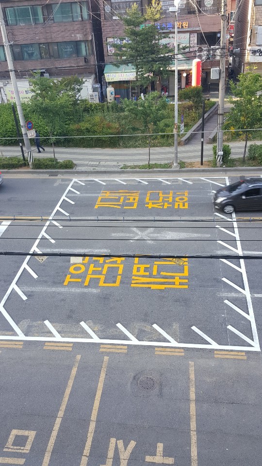 커다란 네모 상자에 안쪽으로 빗살무늬들이 그려져 있는 도로표시가 있는데요. 흔히 교차로나 소방서 앞 노면에서 볼 수가 있습니다.