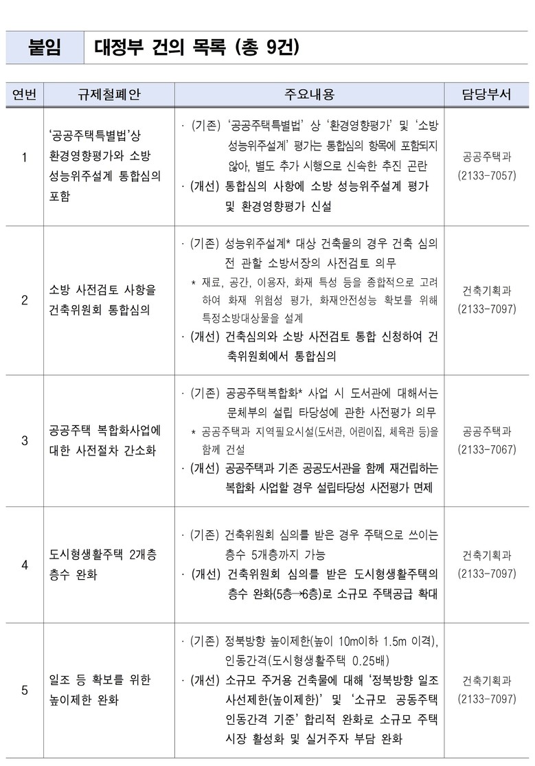 - 공공주택 건립 시 받는 심의 통합, 소규모 주택 공급 여력 제고위한 규제 완화 건의