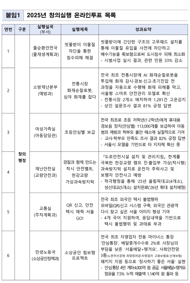 시는 시민 불편을 해소한 창의적이고 혁신적인 성과를 발굴해 서울시 행정 전반에 확산하고자, 지난 9월 24일(수)부터 10월 17일(금)까지 서울시, 자치구, 투출기관 직원들을 대상으로 ‘2025년 창의실행’ 공모를 진행했다.