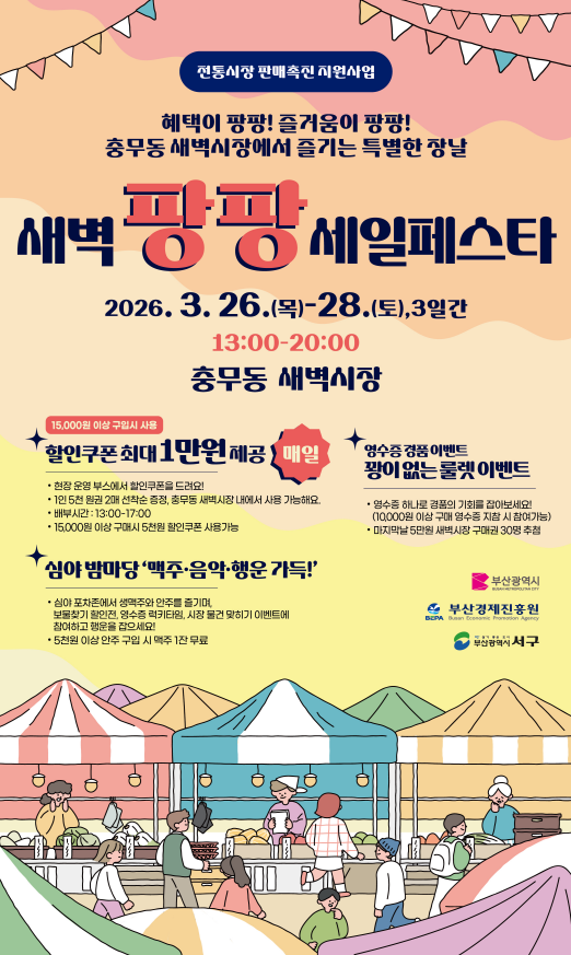 박형준 시장은 “이번 행사는 전통시장에 새로운 활력을 불어넣고, 시민들에게는 특별한 추억을 선사할 소중한 기회가 될 것이다”라며, “앞으로도 우리시는 전통시장 상권 활성화를 체감할 수 있는 다양한 소비 촉진 프로그램을 지속적으로 추진해 나가겠다”라고 전했다.