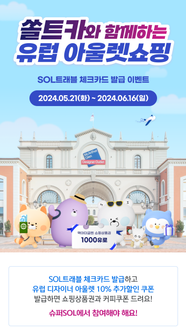 먼저 ‘신한 슈퍼SOL’ 이벤트 페이지를 통해 ‘SOL트래블 카드’를 신규 발급 받은 고객은 전 세계 9개국 25개 맥아더글렌 디자이너 아웃렛에서 사용할 수 있는 ‘10% 추가할인 쿠폰’을 발급 받을 수 있다.