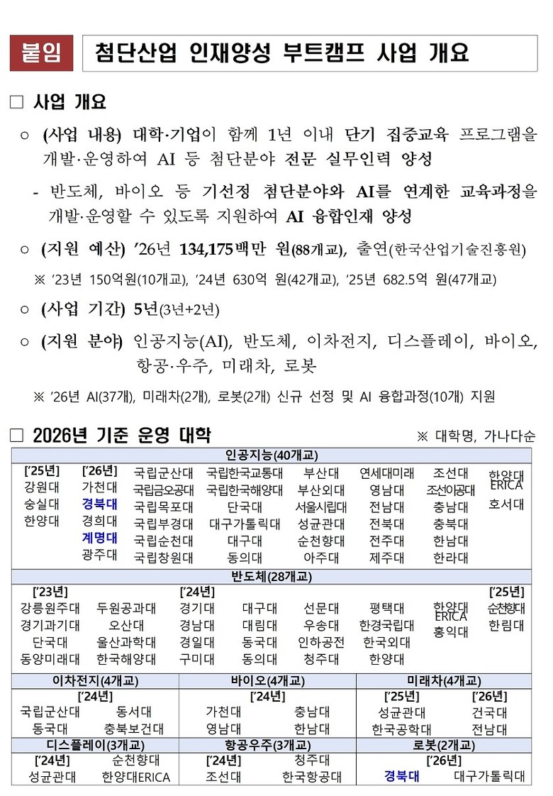 ‘첨단산업 인재양성 부트캠프’ 사업은 AI·로봇 등 급변하는 기술환경에 즉시 대응할 수 있는 첨단분야 실무형 전문인력 양성을 위해 대학과 기업이 협력해 운영하는 1년 이내의 단기 집중 교육과정으로, 교육부의 핵심 인재양성 사업이다.