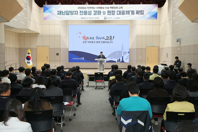 [고흥군 세계타임즈=우덕현 기자] 고흥군(군수 공영민)은 지난 11일 군청 우주홀에서 대규모 자연재난 발생에 대비해 지방정부의 수습 역량을 강화하고 현장 중심 대응체계를 확립하기 위해 ‘2026년 자연재난 사례 중심 수습 역량강화 교육’을 실시했다고 밝혔다.