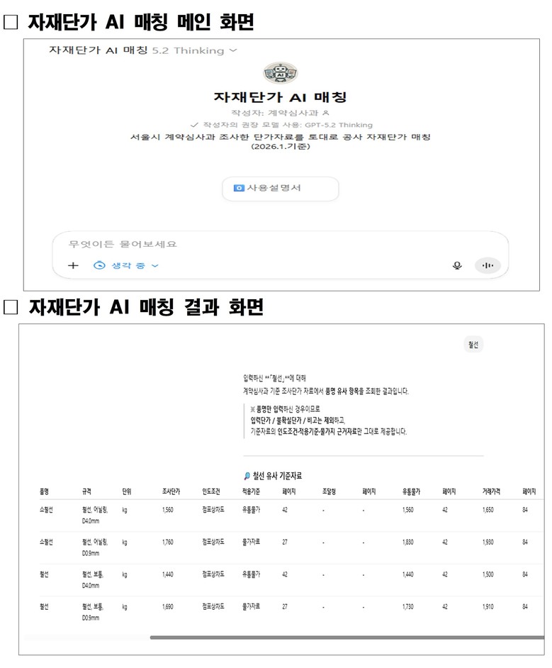 시범 사용기간에 참여했던 자치구 직원들의 반응도 좋았다. 송파구의 한 직원은 “처음 ‘공사 자재단가 AI매칭 서비스’를 접했을 때, 현장에서 겪는 불편을 아이디어로 제안하여 실제로 구현했다는 점이 인상적이었다”라며, “특히 단가 출처와 페이지 정보까지 함께 확인할 수 있어 실무에 자주 활용한다”라고 말했다.