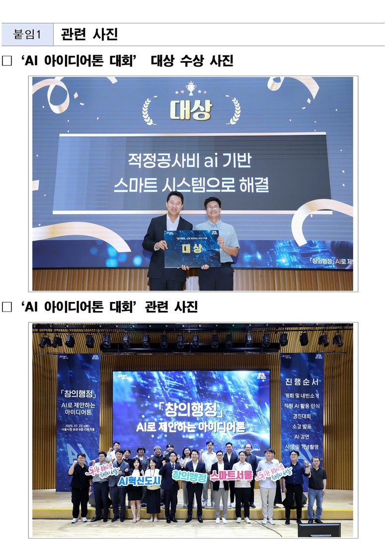 - 시·자치구 공사 부서에 공유…기존 2~3일 소요되던 자재 단가 조사 반나절로 줄여 조기 착공 지원 [서울 세계타임즈=이장성 기자] AI 열풍이 서울시 행정 현장을 바꾸고 있다. 2025년 ‘창의 행정 AI 아이디어톤 대회(’25. 7. 22.)’에서 대상을 받은 아이디어가 서울시와 자치구 공사 부서에서 본격 구현됐다.