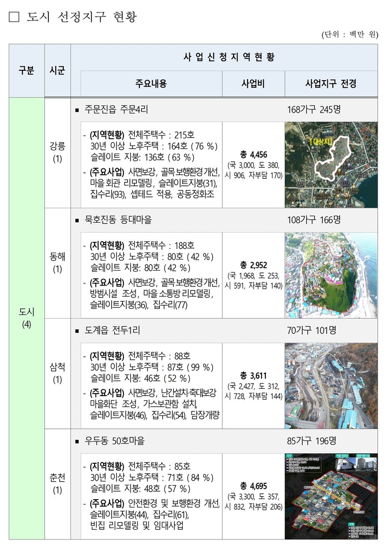 올해는 지난해(농어촌 3, 도시 1개소 선정)보다 크게 확대된 총 8개 지구(농어촌 4, 도시 4)가 선정되었으며, 특히 도시 지역은 전국 17개소 중 4개소가 강원자치도에서 선정되어 23.5%를 차지하는 성과를 거두었다.