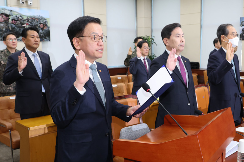 최상목 대통령 권한대행 부총리 겸 기획재정부 장관이 6일 서울 여의도 국회에서 열린 '윤석열 정부의 비상계엄 선포를 통한 내란 혐의 진상규명 국정조사 특별위원회' 3차 청문회에서 증인 선서를 하고 있다. 2025.2.6