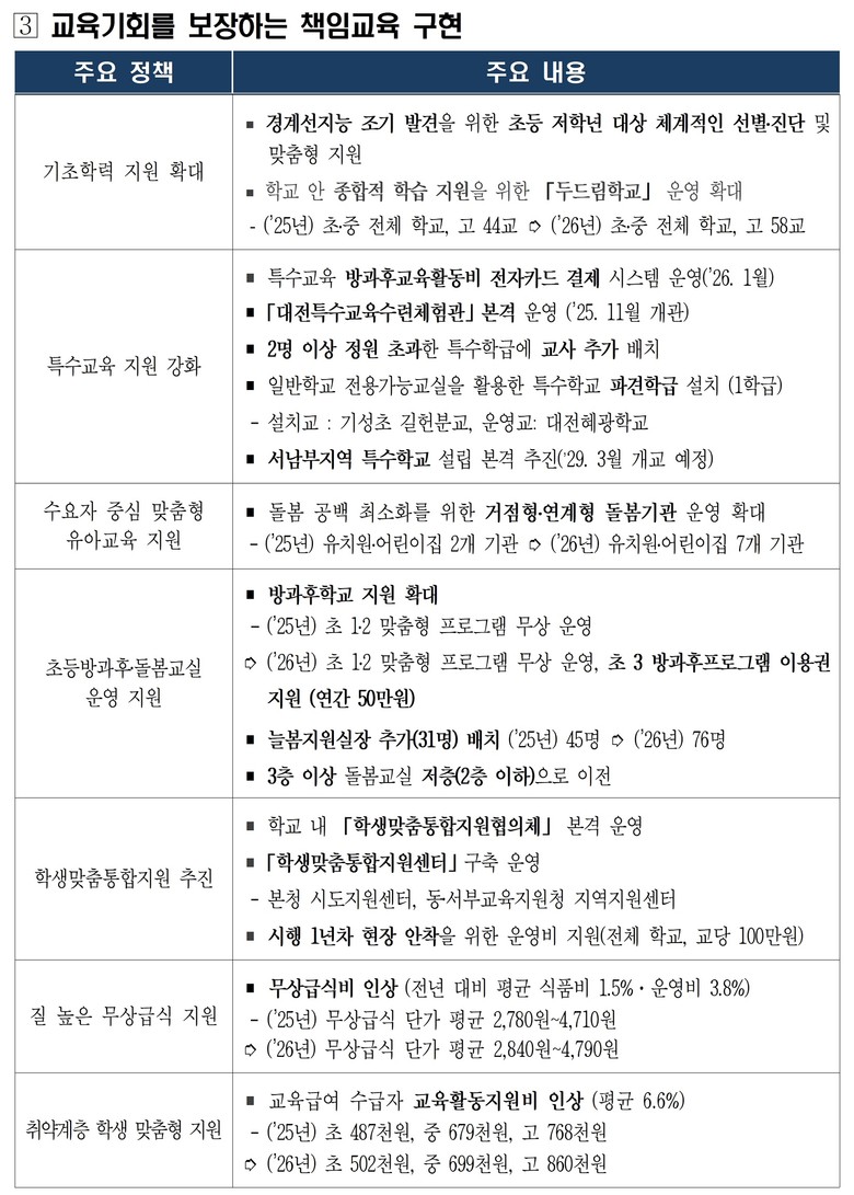 「바른성장지원사업」과 「학생 마음바우처」운영으로 학생의 신체·정서의 균형 있는 성장을 지원하고, 교육공동체 힐링파크 개장과 대전특수교육수련체험관 개관, 에듀힐링센터·위(Wee)센터 확장 이전 등 교육가족을 위한 심리·정서 지원 여건을 개선하였다. 또한, 늘봄지원실장 배치와 초등 2학년까지 맞춤형프로그램 확대로 초등방과후·돌봄의 책임성을 높이고, 무상급식비와 교육급여 교육활동비 단가를 인상하여 모든 학생이 건강하고 즐겁게 성장할 수 있도록 지원을 강화하였다.