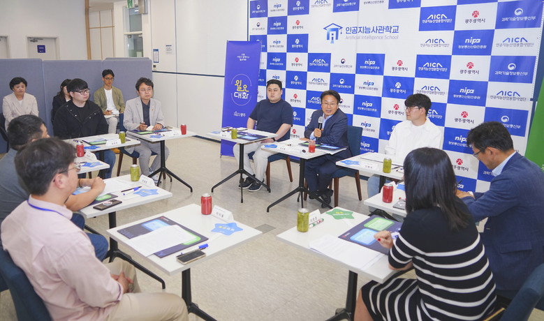 이날 대화에는 강기정 시장을 비롯해 전광명 인트플로우㈜ 대표, 함민혁 젠데이터 대표, 인공지능사관학교 4기 졸업생인 신범식 ㈜AI캠퍼스 연구원과 박승주 ㈜엔큐브 주니어, 이지웅 인공지능사관학교 제5기 교육생, 정창현 학생(조선대), 박수기 광주시의원, 이은경 호남대 인공지능(AI)융합인재양성사업단장, 김용승 광주시 인공지능산업실장 등이 참석했다.