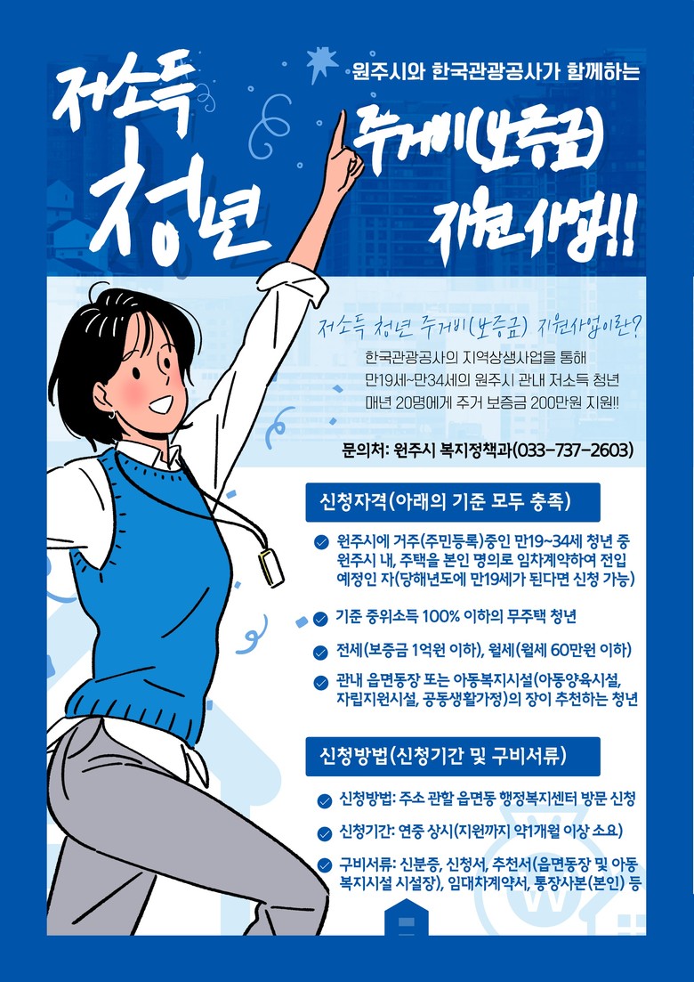 지난해 4월 원주시-강원특별자치도-한국관광공사 간 체결한 업무협약에 따라 공사의 후원금으로 연간 20명에게 1인당 200만 원씩 주거비를 지원한다.