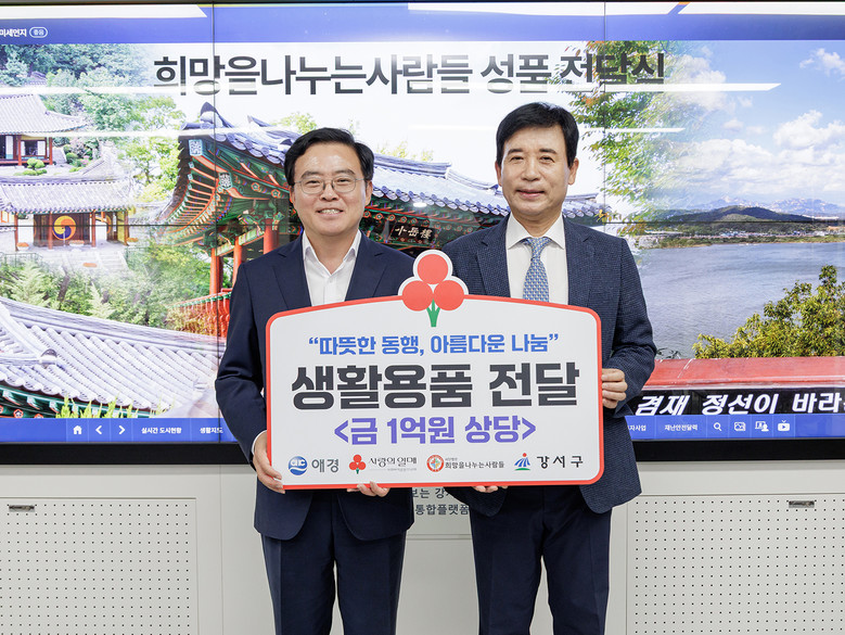 [강서구 세계타임즈=이장성 기자] 서울 강서구(구청장 진교훈)는 11일(목) (사)희망을나누는사람들(회장 김정안)로부터 1억 원 상당의 이웃돕기 성품 1,170박스를 전달받았다.