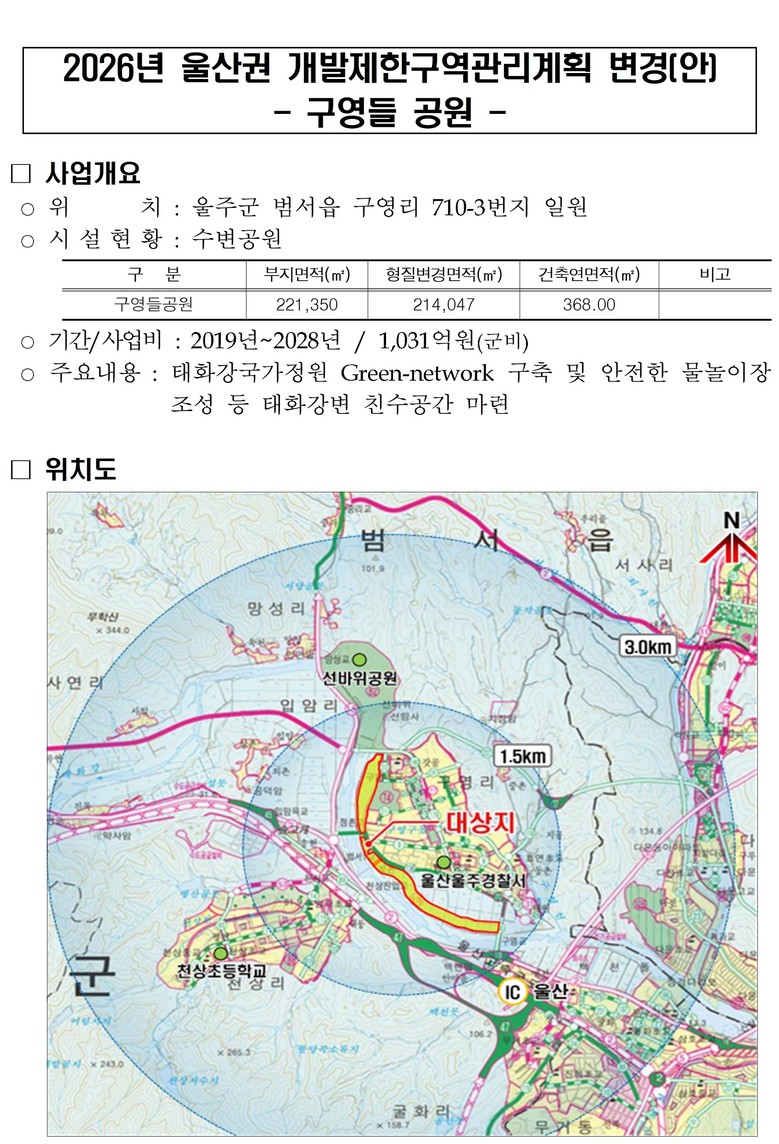 울주군 구영들공원 … 22만 1,350㎡ 수변공원 조성 본격 추진 [울산 세계타임즈=이호근 기자] 울산시는 3월 20일 열린 국토교통부 제5회 중앙도시계획위원회에서 ‘2026년 울산권 개발제한구역관리계획 변경(안) 구영들공원’이 심의를 통과함에 따라 구영들공원 조성을 본격 추진한다고 밝혔다.