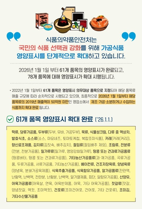 영양성분 표시제도는 1996년부터 우유류, 햄·소시지류 등 일부 품목을 대상으로 운영됐다. 이번 확대 시행에 따라 기존 의무화 대상이 아니었던 베이컨류, 건조저장육류, 양념육류, 식육추출가공품, 알가공품류, 산양유를 생산하면서 품목류 연 매출액 50억 원 미만 업체가 의무 적용 대상에 추가된다. 이후 2028년까지는 식육케이싱, 식육간편조리세트 등 특수 품목 제조업체로 적용 범위가 확대될 예정이다.