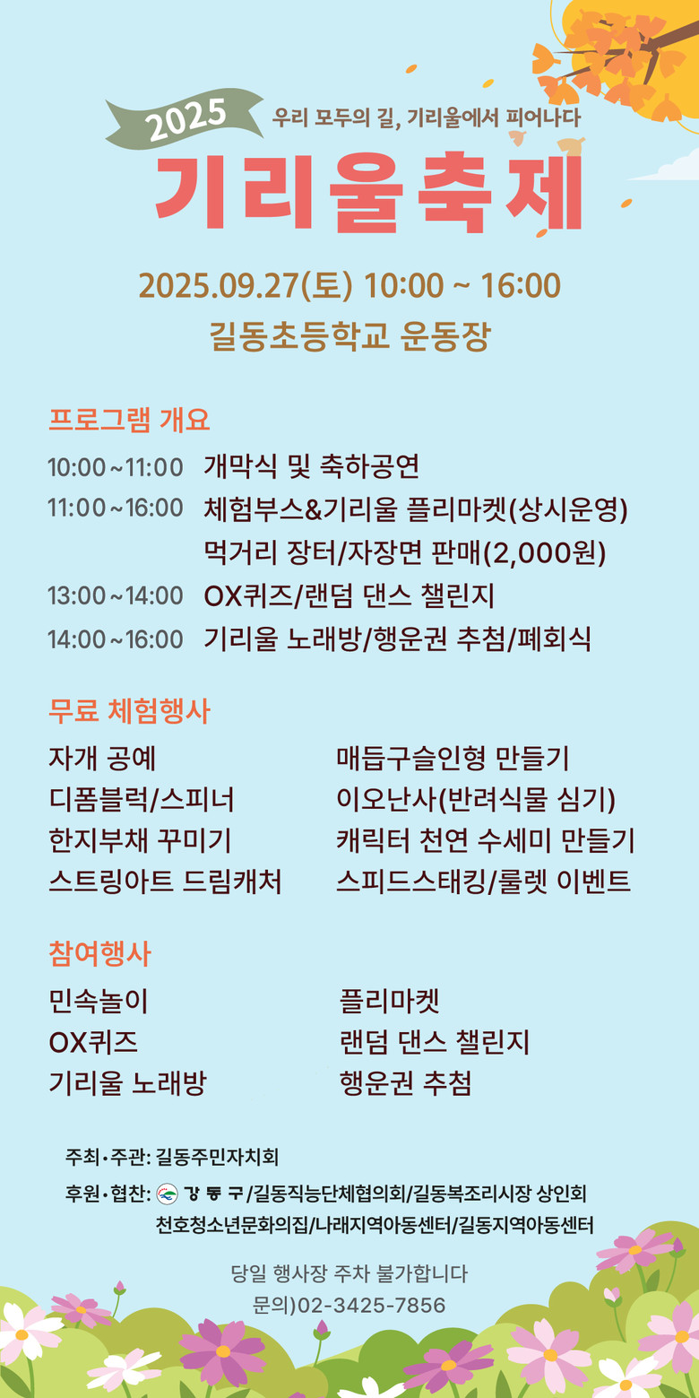 - 체험 부스, 먹거리, OX퀴9즈, 랜덤댄스 챌린지, 기리울노래방 등 다양한 프로그램 마련 [강동구 세계타임즈=이장성 기자] 강동구(구청장 이수희) 길동은 오는 27일(토) 10시부터 16시까지 길동초등학교 운동장에서 주민 화합을 위한 ‘2025 기리울 축제’가 열린다고 밝혔다.