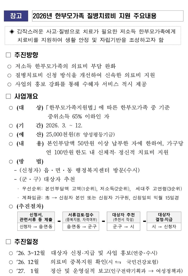 이 사업은 사고나 질병으로 치료가 필요한 저소득 한부모가족에게 의료비 본인부담액의 일부를 지원해 경제적 부담을 완화하고 안정적인 생활을 돕기 위해 마련됐으며, 인천시 양성평등기금을 활용해 추진된다.