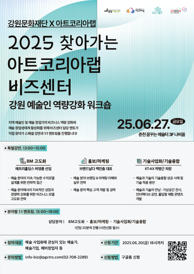 강원 예술인 역량강화 워크숍 <2025 찾아가는 아트코리아랩 비즈센터>는 본인이 가진 문화예술적 재능을 수익 창출을 위한 사업역량으로 발전시키고자 하는 강원 지역의 예술인, 예술기업, 예비 창업자라면 누구든 신청할 수 있다.