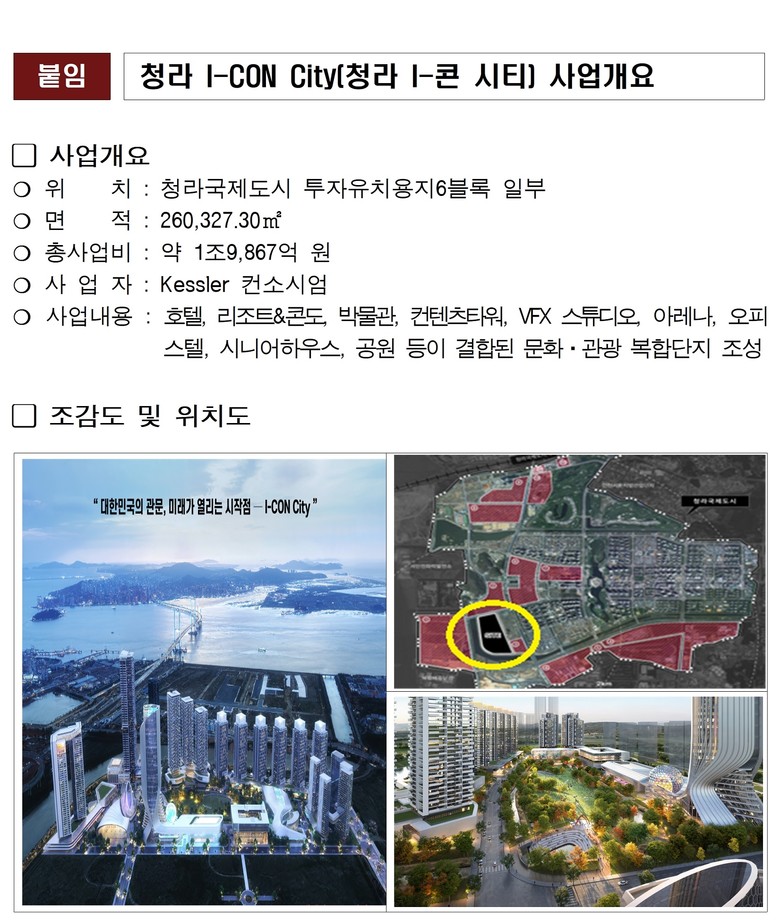 청라 I-CON City 프로젝트는 인천시가 추진 중인 K-콘랜드 프로젝트의 일환으로 인천시 서구 청라국제도시 투자유치용지에 약 26만㎡ 규모로 조성될 예정이다.
