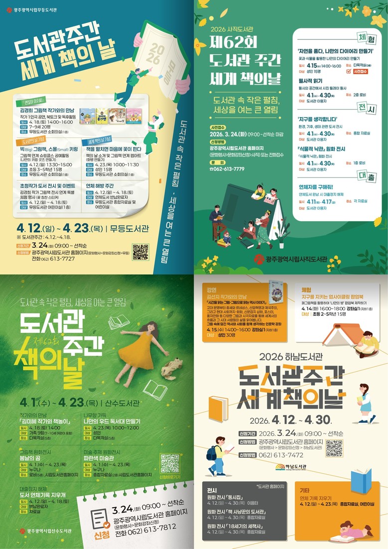 강연·체험 프로그램 참가 신청은 3월 24일부터 시립도서관 누리집 ‘문화강좌 신청’ 메뉴에서 하면 된다. 자세한 사항은 누리집(https://citylib.gwangju.go.kr)을 참고하거나 무등(613-7727), 사직(613-7779), 산수(613-7812), 하남(613-7472) 도서관으로 문의하면 된다.