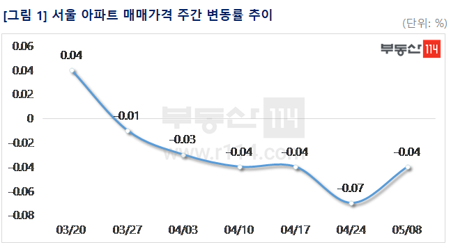 부동산114(www.r114.com)에 따르면 연휴로 인해 2주간의 시세 조사분이 반영됐음에도 불구하고 서울 아파트 매매가격 변동률은 2주전 보다 하락폭(-0.07%)이 줄어든 -0.04%를 기록했다. 재건축 아파트와 일반 아파트가 각각 0.13%, 0.02% 떨어졌다. 이밖에 경기ㆍ인천이 0.05% 올랐고 신도시는 보합세(0.00%)를 나타냈다.