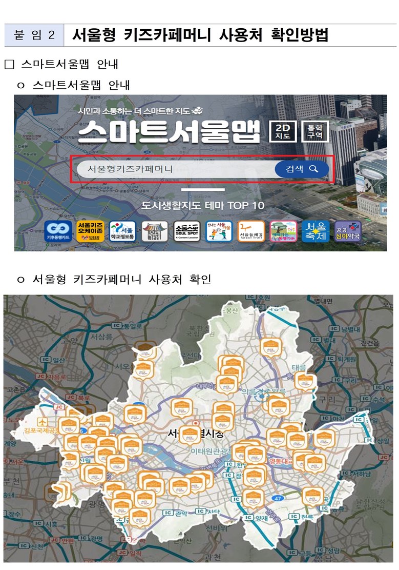‘서울형 키즈카페머니’ 상품권 이용이 가능한 민간 키즈카페는 서울시 도시생활지도인 ‘스마트서울맵(map.seoul.go.kr)’에서 위치와 주소를 확인할 수 있고, 서울페이플러스 앱 내 가맹점 목록에서도 확인 가능하다. (※ 자세한 사용처 목록은 붙임1 참조)