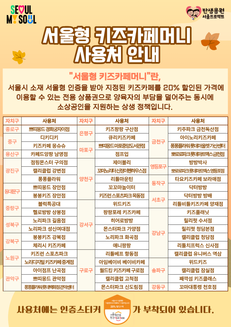 또한 해당 키즈카페에는 ‘서울형키즈카페머니’ 상품권 도어스티커() 및 서울형 인증스티커()가 부착되어 있어 방문자들에게 편의를 제공하고 있다.