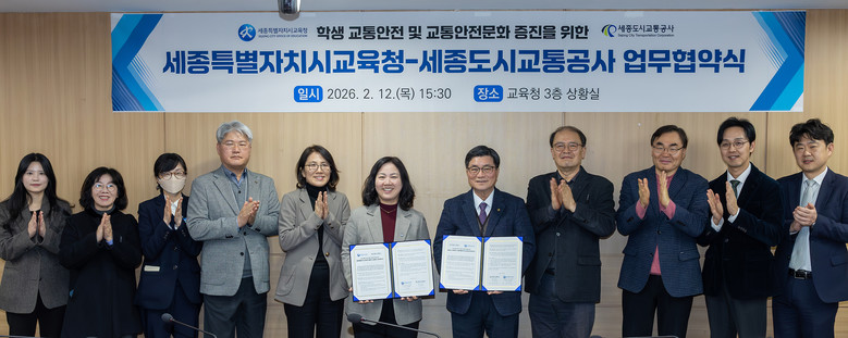 [세종 세계타임즈=이채봉 기자] 세종특별자치시교육청(교육감 권한대행 부교육감 구연희, 이하 세종시교육청)은 2월 12일(목) 15시 30분에 세종시교육청 상황실에서 세종도시교통공사와 ‘학생 교통안전 강화 및 교통안전문화 증진을 위한 업무협약(MOU)’을 체결했다.