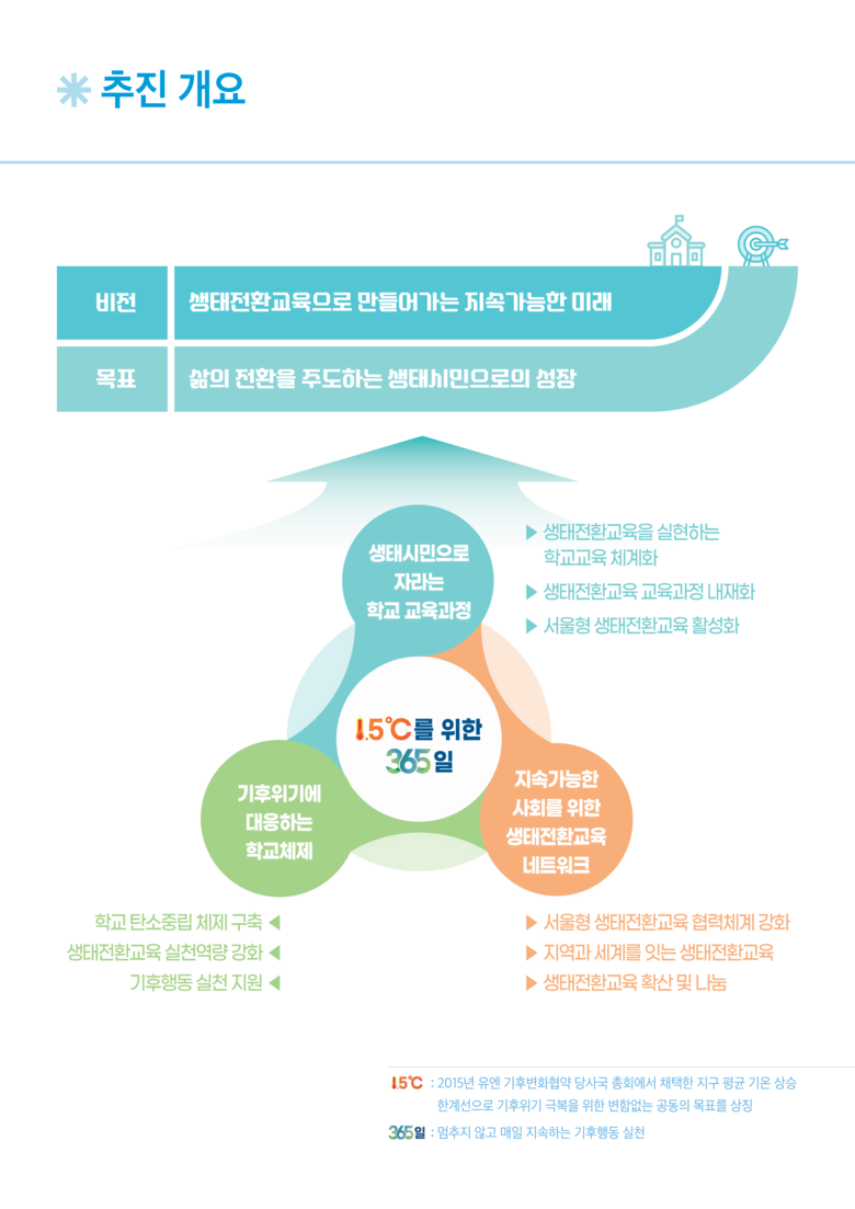 이라는 슬로건 하에 ‘삶의 전환을 주도하는 생태시민으로의 성장’을 목표로, 통합·전환·실천·협력이라는 핵심 가치를 지속적으로 추구한다. 또한 대도시 서울의 특성을 반영해, 자연환경과 첨단 디지털 환경이 공존하는 ‘서울형 생태전환교육’을 새롭게 도입한다.