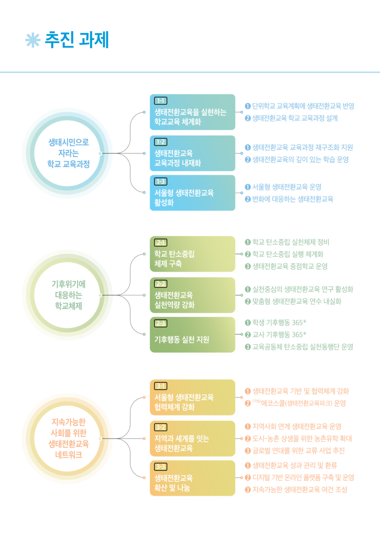 생태시민으로 자라는 학교 교육과정: 단위학교 교육계획에 생태전환교육을 반영하고, 학교급별 연계 교육과정을 설계한다. 아울러 서울형 생태·환경 프로젝트를 운영하고, 생태전환교육을 내재화하는 방안을 추진한다.