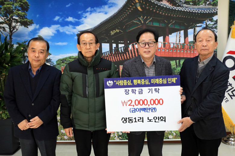 [인제군 세계타임즈=김민석 기자] 상동1리 노인회(회장 정유훈)는 2월 20일 인제군청을 방문해 지역 인재 양성을 위해 써달라며 장학금 200만 원을 최상기 군수에게 전달했다.