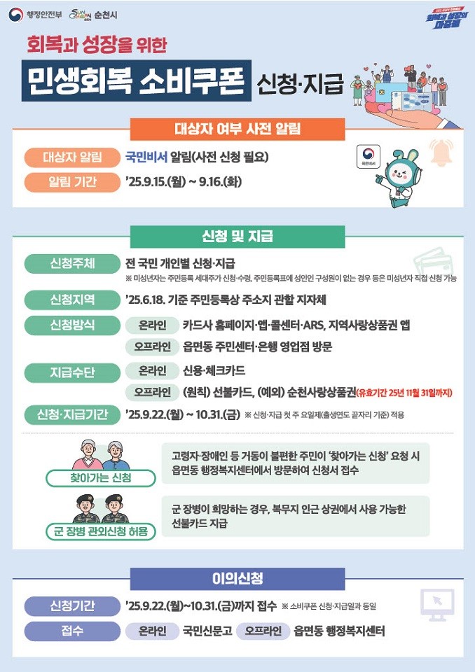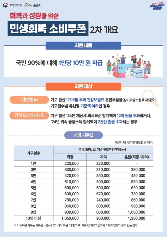 특히 2차 소비쿠폰은 사용 편의를 확대하기 위해 기존 사용처 외에도 읍·면 지역 하나로마트 및 파머스마켓(12개소)과 순천 로컬푸드 직매장(3개소)까지 이용 가능하도록 했다.