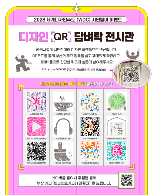 이번 사업은 수영만요트경기장 주변의 다소 칙칙하고 단조로운 공사장 가림막(총 830m)을 '디자인 큐알(QR) 담벼락전시관'으로 탈바꿈해, 시민들이 시정 주요 정책과 '세계디자인수도(WDC) 부산'의 비전을 현장에서 직접 확인하고 참여할 수 있도록 기획한 것이다.