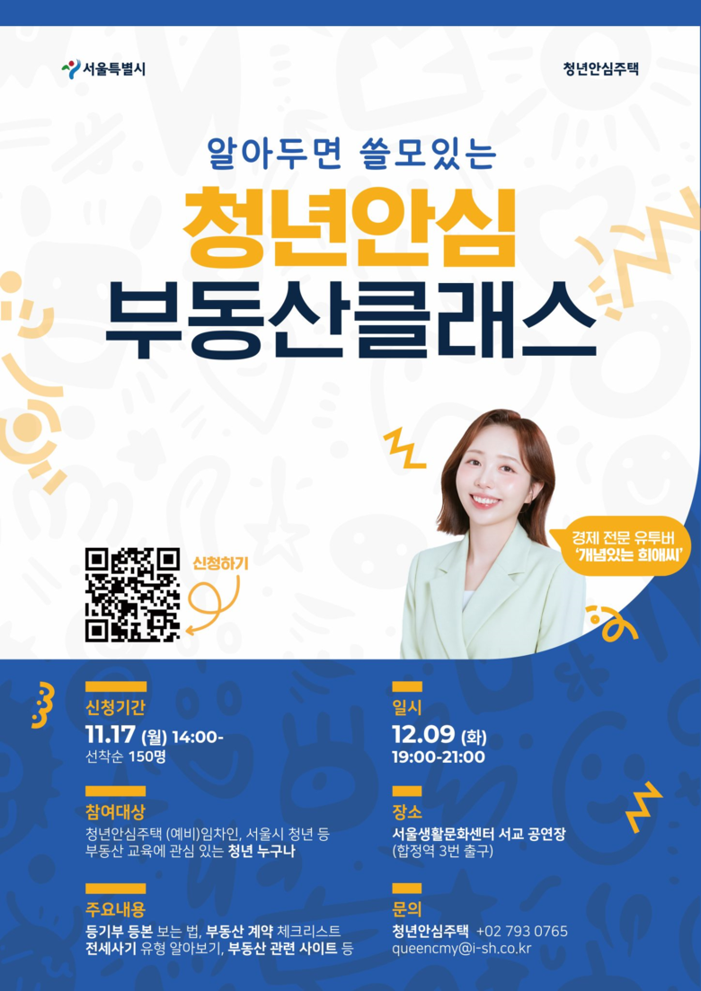 - 2025년 총 4회차 교육 완료... 내년에는 청년 관심 주제 중심 지속 추진 [서울 세계타임즈=이장성 기자] 서울시는 서울주택도시공사(SH)와 함께 청년안심주택(예비) 임차인 및 서울시 청년을 대상으로 운영한 ‘찾아가는 청년 맞춤형 부동산 교육(총 4회차)’이 12월 9일(화) 올해 마지막 일정으로 마무리됐다고 밝혔다. 이번 교육은 서울생활문화센터 서교 공연장에서 진행됐으며, 청년안심주택(예비) 임차인을 비롯한 서울시 청년 150여 명이 참석해 높은 관심을 보였다.