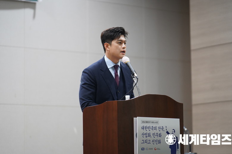 '김용태' 전 국민의힘 비상대책위원장이 11일 오후 서울 동작구 김영삼도서관에서 열린 김영삼대통령10주기 기념 세미나시리즈 ‘대한민국의 건국, 산업화, 민주화 그리고 선진화’ 2차 세미나에서 인사말을 하고 있다.
